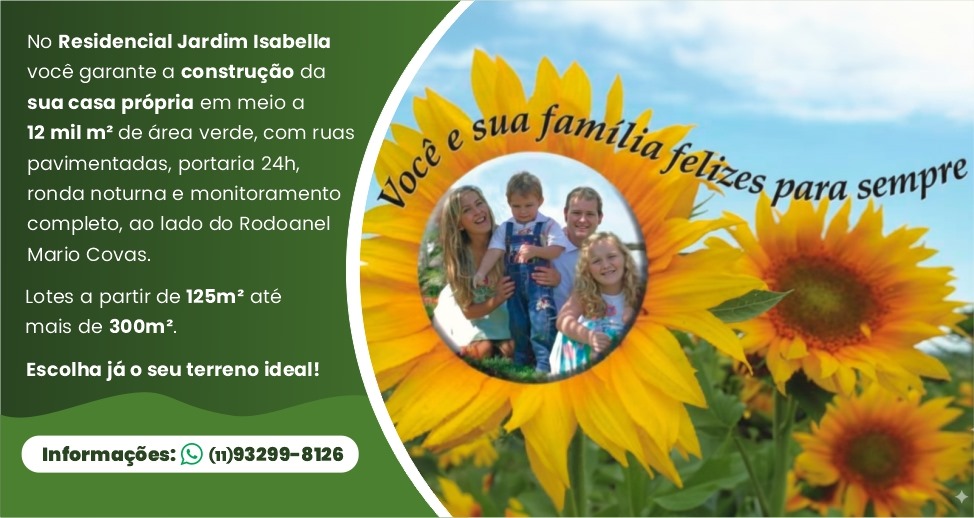 No Residencial Jardim Isabella você pode ter sua casa própria, cercada por uma área verde com aproximadamente 12 mil m², com vias pavimentadas, totalmente murado, com cerca elétrica e sistema de monitoramento, ronda noturna, portaria com guarita 24 horas, ao lado do Rodoanel Mario Covas.